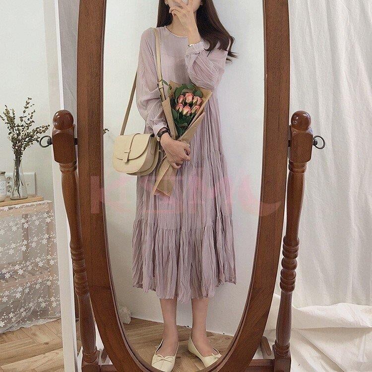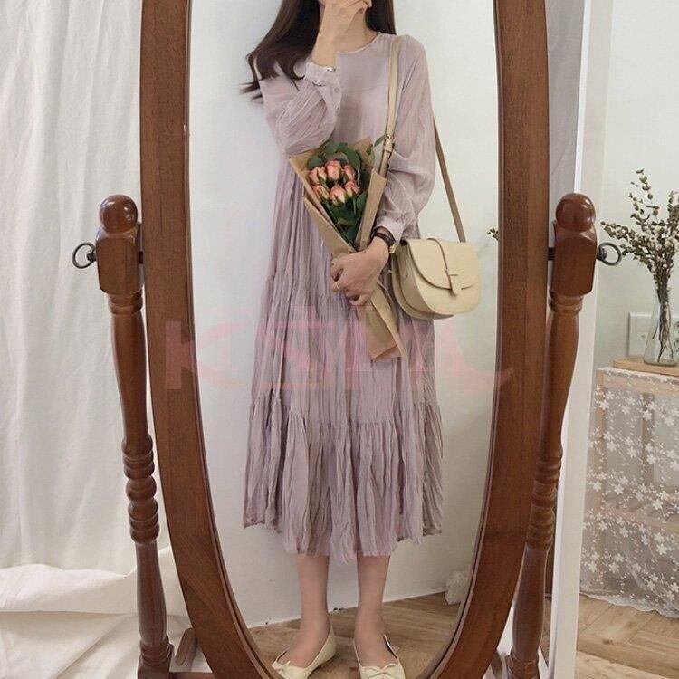 ワンピース マキシ丈 レディース 長袖 2色 プリーツスカート きれいめ 韓国風 韓国 ファッション コーデ おすすめ カジュアル きれいめ 大きいサイズ 人気 ゆったり 20代 30代 40代 50代