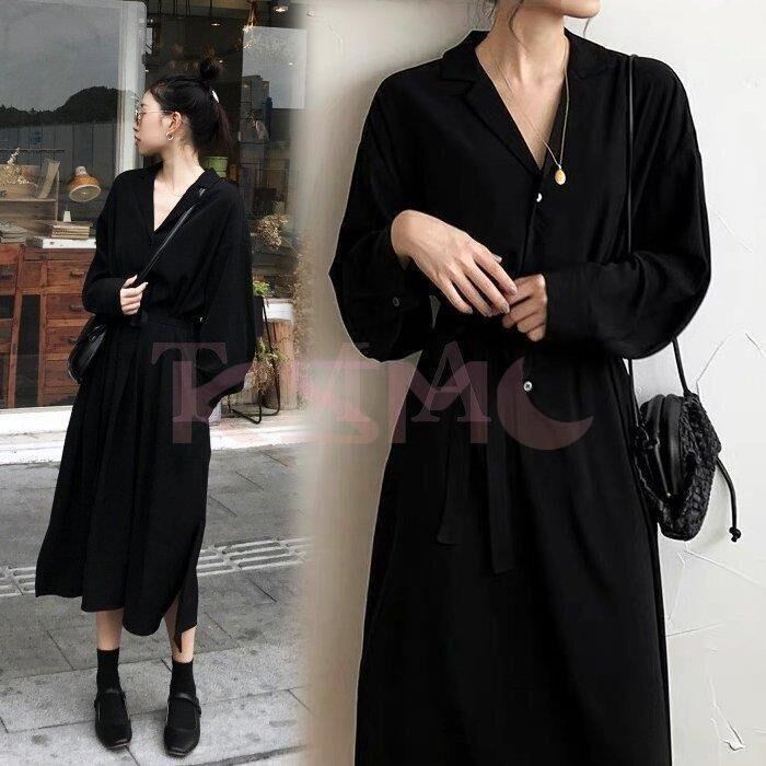 ワンピース シャツワンピース レディース 黒 Vネック 長袖 韓国風 韓国 ファッション コーデ おすすめ カジュアル きれいめ 大きいサイズ 人気 ゆったり 20代 30代 40代 50代