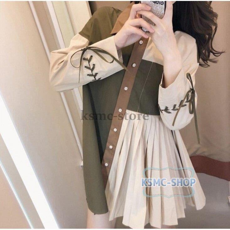 シャツ ブラウス レディース 長袖 配色切替え ゆったり プリーツ 韓国風 7424