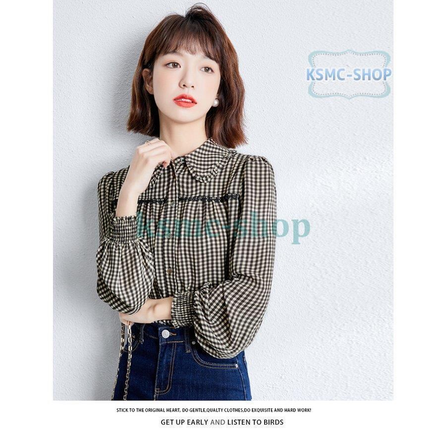 ブラウス シャツ レディース 長袖 チェック柄 ボリューム袖 きれいめ おしゃれ 韓国風 7433