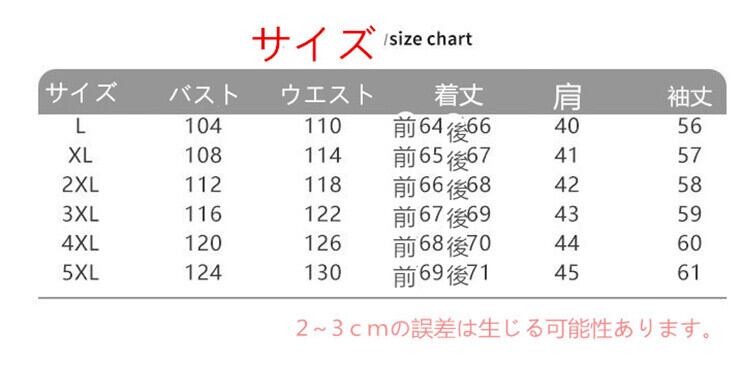 5XL:バスト124 ウエスト130 着丈前69/後ろ71 肩幅45 袖丈61