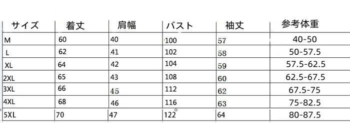 5XL:着丈70 肩幅47 バスト122 袖丈64 参考体重80-87.5kg