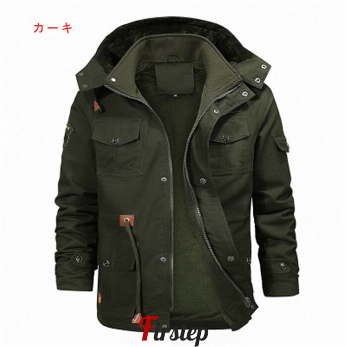 ★特徴:秋秋のカジュアルコーデにおすすめのミリタリージャケットです。裏ボアで防寒性抜群。フードは取り外し可能です。