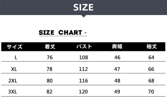 2XL:着丈80バスト116 肩幅48 袖丈68