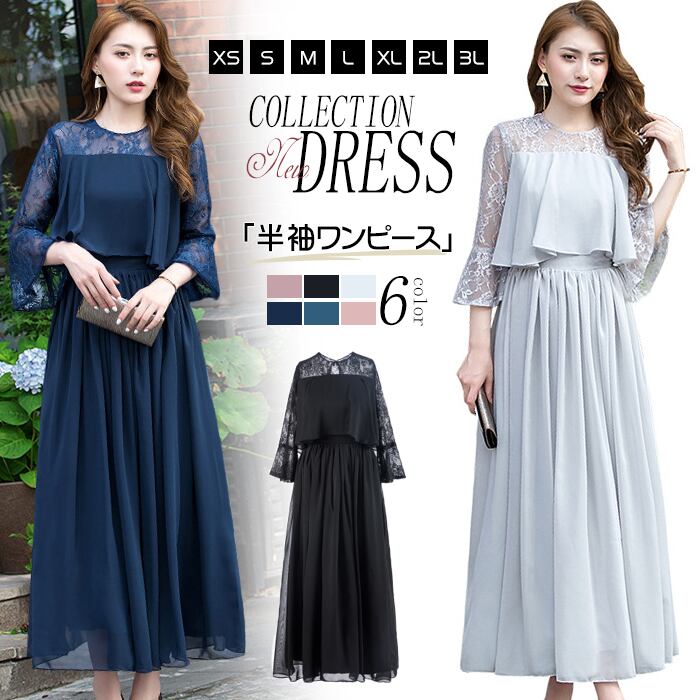 ワンピース ドレス パーティードレス レディース XS-XXXL 6色 半袖 ロング丈 フォーマル レース 結婚式 二次会 パーティー 韓国 ファッション コーデ おすすめ カジュアル きれいめ 大きいサイズ 人気 ゆったり 20代 30代 40代 50代