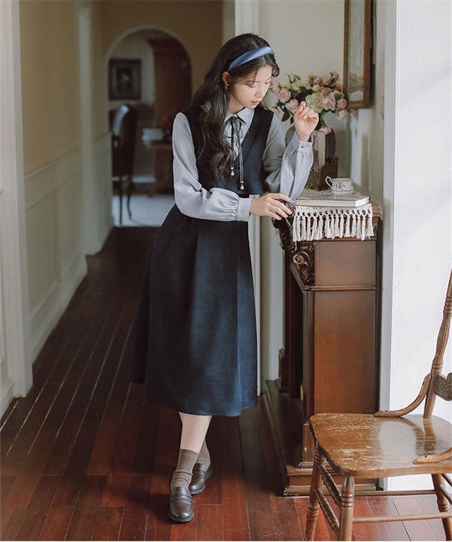 ワンピース レトロワンピース レディース 2色 S-L 長袖 レトロ 韓国 カジュアル 7843