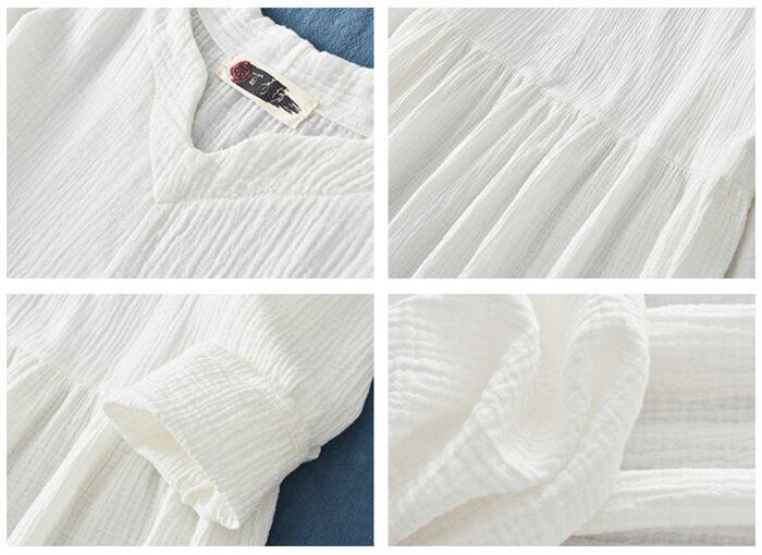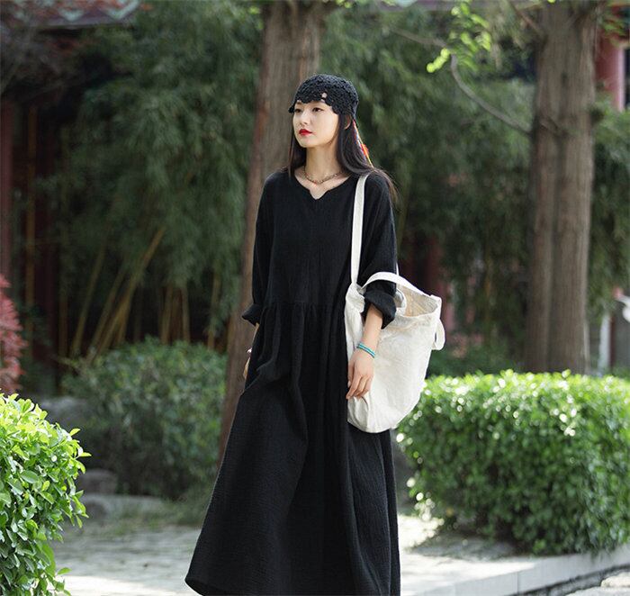 ワンピース レディース 3色 フリーサイズ 長袖 綿麻 カジュアル ロング丈 ゆったり Vネック 無地 韓国 ファッション コーデ おすすめ カジュアル きれいめ 大きいサイズ 人気 ゆったり 20代 30代 40代 50代