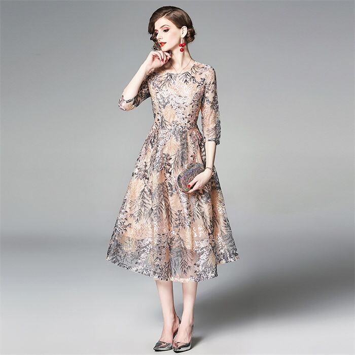 パーティードレス ワンピース 七分袖 レディース ベージュ系 S-XXL 総レース きれいめ Aライン 結婚式 二次会 パーティー 韓国 ファッション コーデ おすすめ カジュアル きれいめ 大きいサイズ 人気 ゆったり 20代 30代 40代 50代