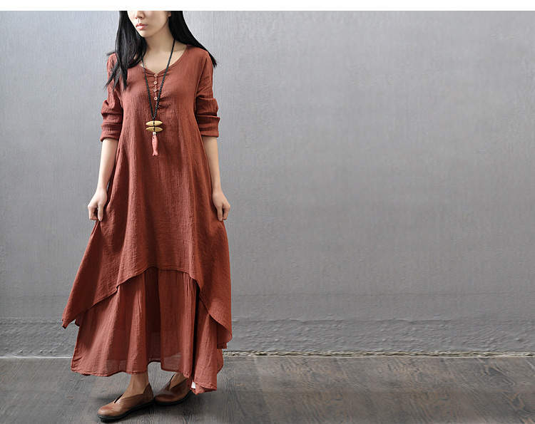 ワンピース 長袖 ロング丈 リネン レディース 3色 M-5XL カジュアル おしゃれ フェイクレイヤード 8004