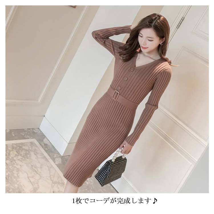 ワンピース ニットワンピース レディース 4色 S-L 長袖 Vネック ひざ丈 ウエストベルト付き 秋冬 8072