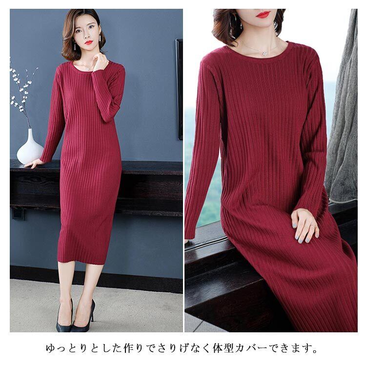 ニットワンピース ロングワンピース レディース 5色 M-3XL ゆったり 長袖 無地 Aライン ロング丈 春秋冬 8083