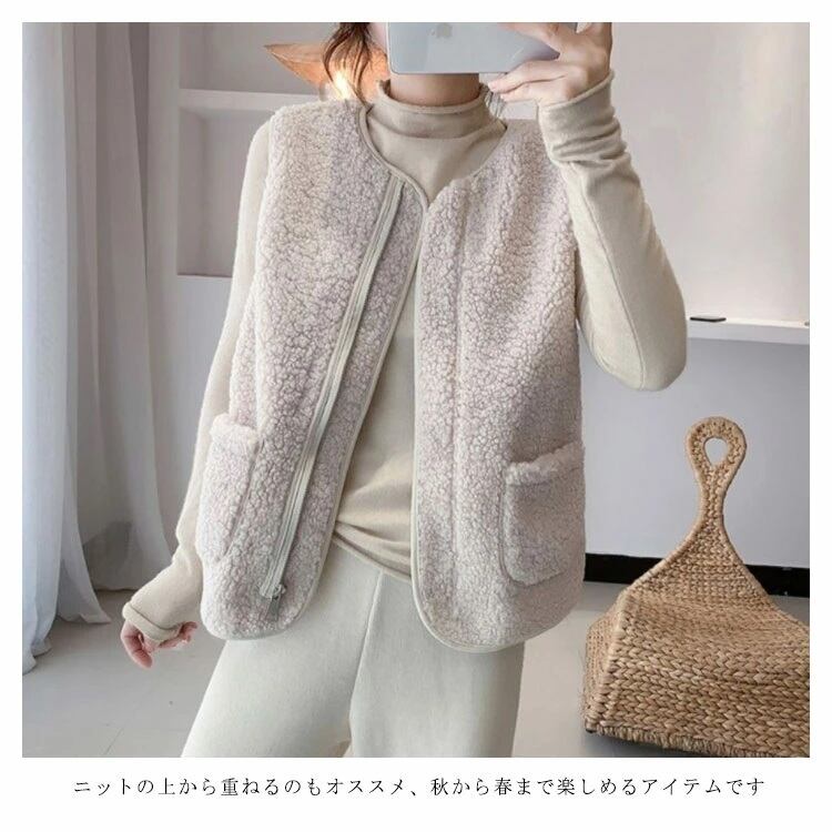 このボアベストは、カジュアルでゆったりとした着心地が特徴であり、もこもことした素材が暖かさを提供します。寒い秋冬シーズンにおしゃれを楽しみながら暖かさを追求してください。