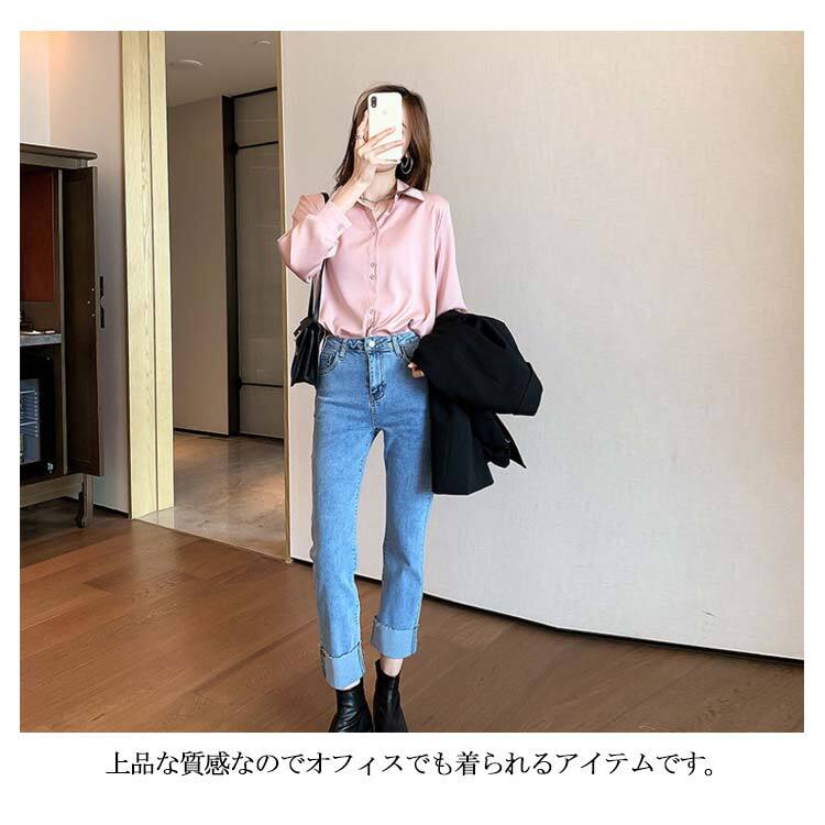 シフォン素材を使用しており、上品で軽やかな印象を与えます。シャツのデザインは、きれいめでシンプルなスタイルでありながらも、女性らしい華やかさを演出します。長袖のデザインは春秋にぴったりで、季節の変わり目にも活躍します。