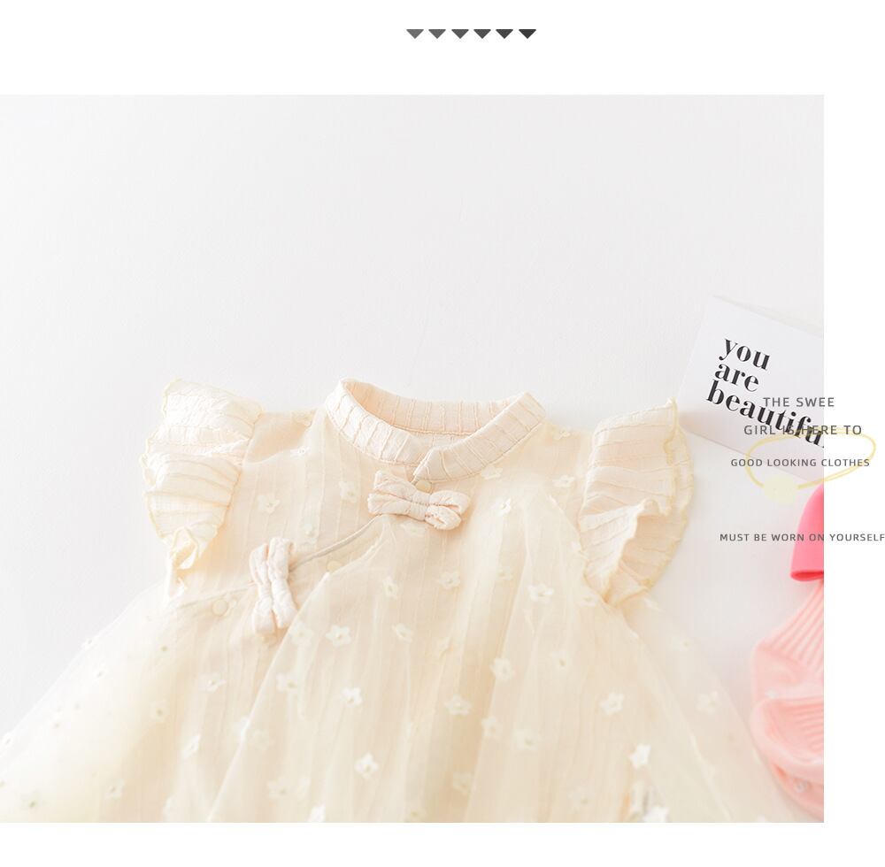 夏の暑い季節にぴったりのデザインで、女の子のおしゃれな姿を演出します。涼しげなベージュカラーは、爽やかで清潔感のある印象を与えます。ワンピースとロンパースが一体になっているため、おむつ替えなどもスムーズに行えます。