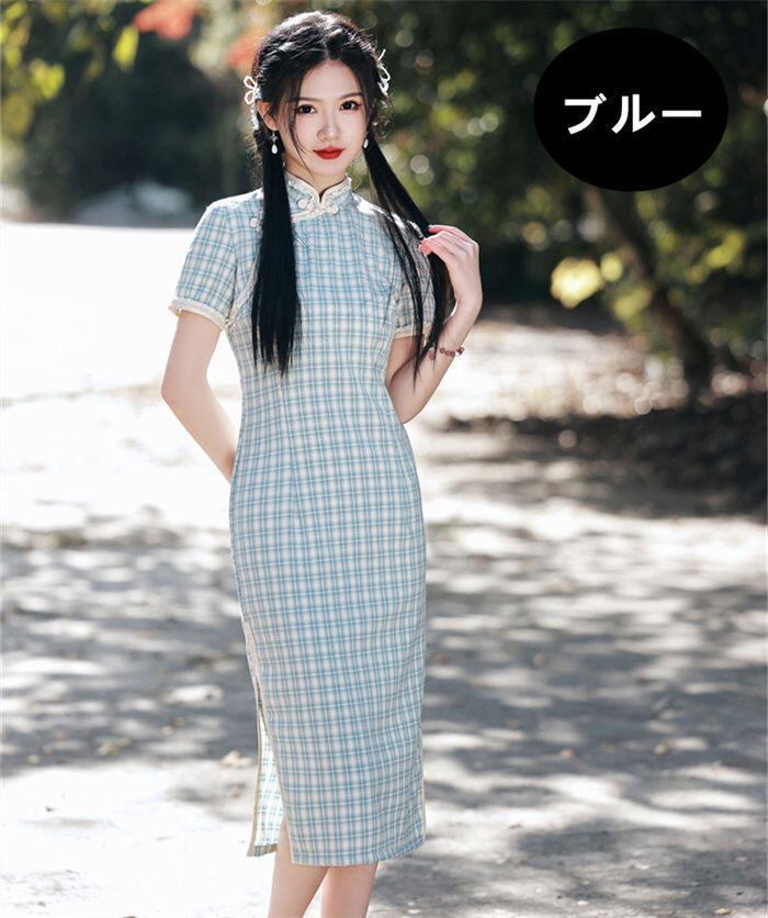 チャイナドレス ワンピース 半袖 レディース 3色 S-2XLsize チェック柄 マキシ丈 ロング丈 コスプレ 韓国 ファッション コーデ おすすめ カジュアル きれいめ 大きいサイズ 人気 ゆったり 20代 30代 40代 50代