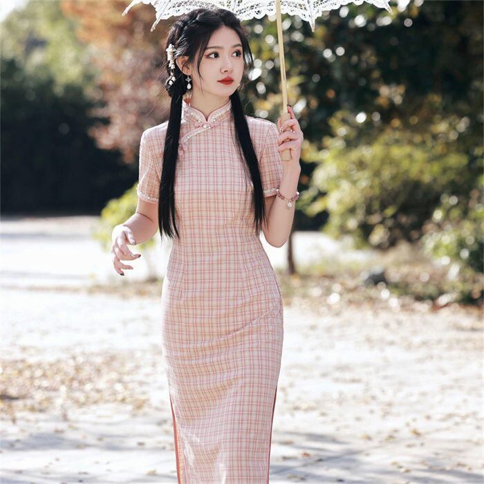 チャイナドレスは伝統的な中国の服装を現代風にアレンジしたもので、その特徴的なデザインは他にはない個性的な雰囲気を醸し出します。チェック柄はカジュアルながらも目を引くデザインで、半袖とマキシ丈の組み合わせは、おしゃれな中にも涼しげさを感じることができます。