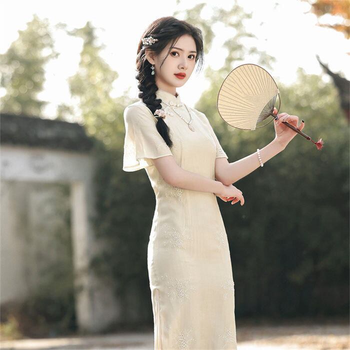 刺繍柄が施されたデザインは、チャイナドレスの特徴であるアジアンな雰囲気を引き立てています。イエローカラーは明るく華やかな印象を与えるため、目を引く存在感を持っています。半袖のデザインとひざ丈の丈感は、季節や気温に合わせて着こなすことができます。