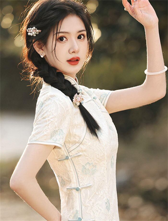 ベージュカラーは穏やかで上品な印象を与えるため、エレガントな装いにぴったりです。刺繍柄がデザインにアクセントを加え、アジアンな雰囲気を演出しています。チャイナドレスの特徴である刺繍やディテールが、ドレス全体に華やかさをもたらしています。