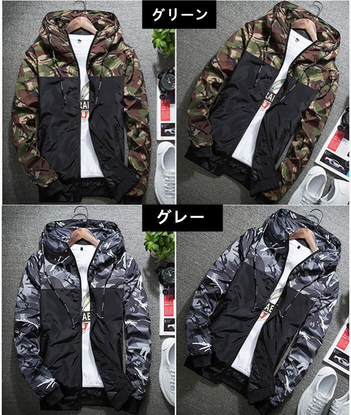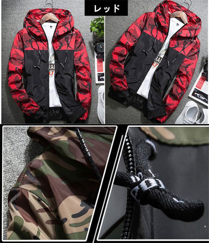 ★特徴:デザイン: このナイロンジャケット、ジップパーカーは、迷彩柄が特徴的なデザインです。カジュアルながらもおしゃれなスタイリングが楽しめるアイテムで、フードが付いているため、風や軽い雨から身を守ることができます。