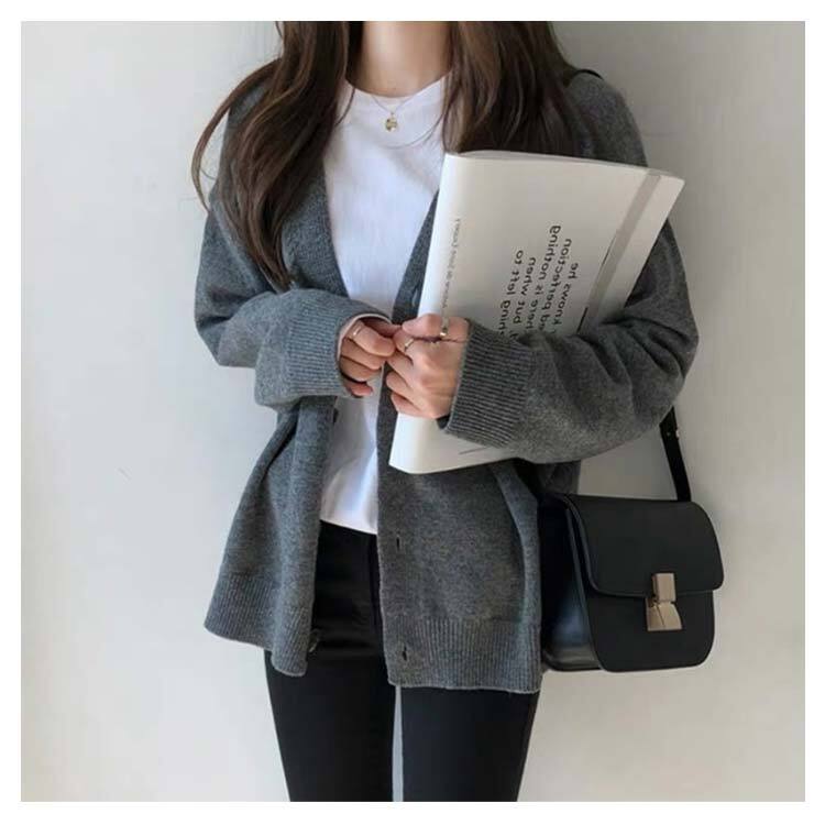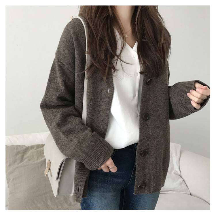 無地のVネック長袖ドルマンスリーブニットカーディガンは、そのシンプルなデザインと汎用性から、オフィスからカジュアルなシーンまで幅広い場面で活躍する一着です。