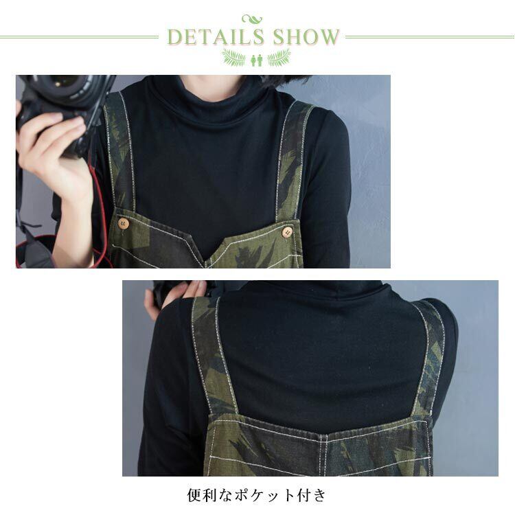 用途: カモフラ柄のオーバーオールは、アウトドアアクティビティやカジュアルな日常のファッションに適しています。カモフラージュ柄はアウトドアのシーンで特に人気があり、キャンプ、ハイキング、フェスティバル、アウトドアイベントなどで着用されることが多いです。