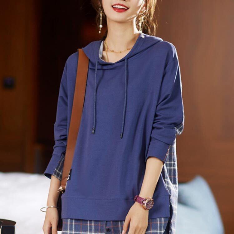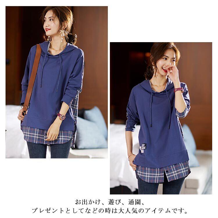プルオーバーパーカー パーカー レディース ブルー 重ね着風 L-5XL 無地xチェック柄 カジュアル 春秋 韓国 ファッション コーデ おすすめ カジュアル きれいめ 大きいサイズ 人気 ゆったり 20代 30代 40代 50代