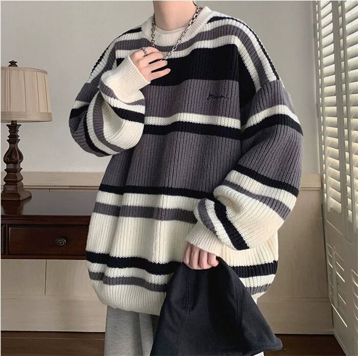 ニット セーター メンズ ボーダー 2色 M-2XL ゆったり ストリート系 カジュアル オーバーサイズ 秋冬 韓国 ファッション コーデ おすすめ カジュアル きれいめ 大きいサイズ 人気 ゆったり 20代 30代 40代 50代