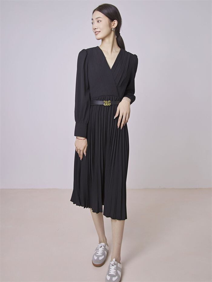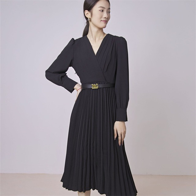 ワンピース レディース ブラック S-XL 長袖 Vネック プリーツワンピース きれいめ オフィス 入学式 卒業式 23zm682