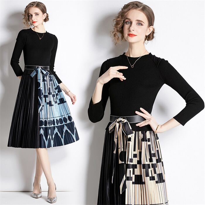 ワンピース ニット切り替え レディース 2色 S-2XL 長袖 プリーツスカート きれいめ オフィス パーティー 23zm683