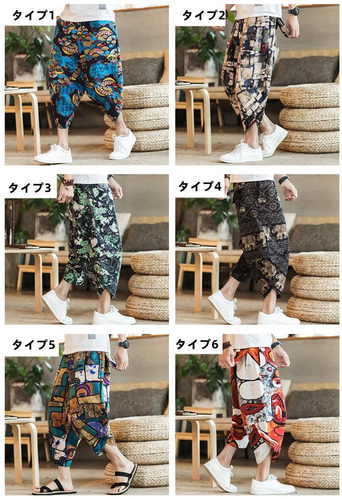 サルエルパンツ 綿麻 7部丈 メンズ 9色 M-5XLsize ワイドパンツ 総柄 ゆったり ウエストゴム カジュアル 24zm657