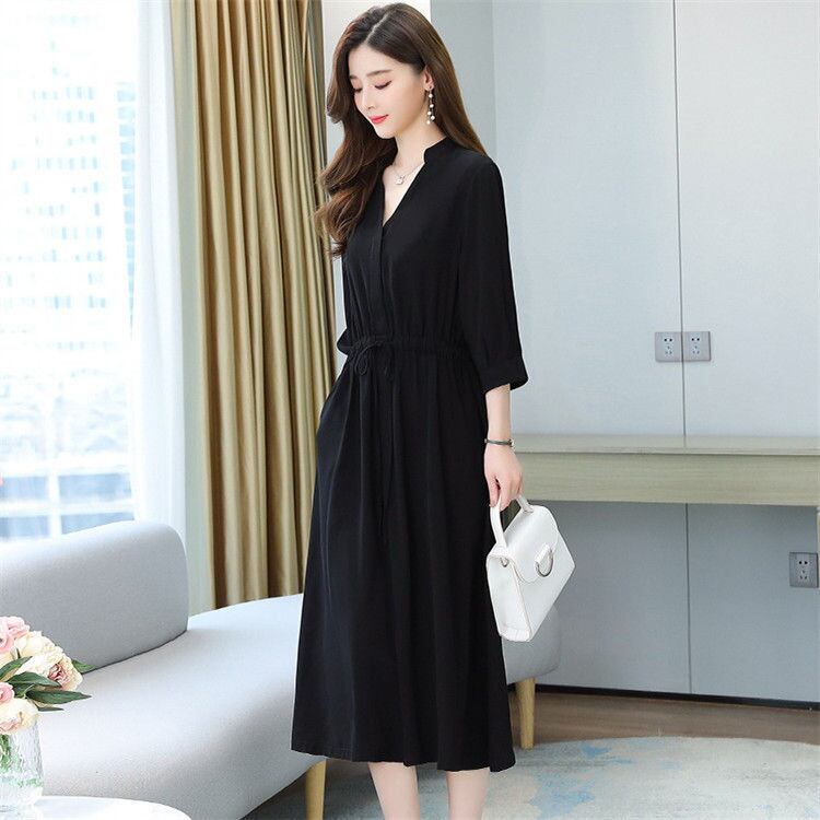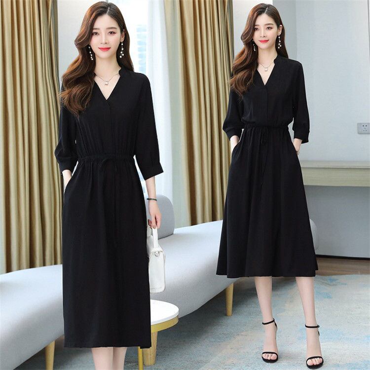 ワンピース Vネック 七分袖 レディース 黒 S-2XL フォーマル ミモレ丈 結婚式 二次会 24zm948