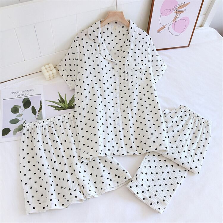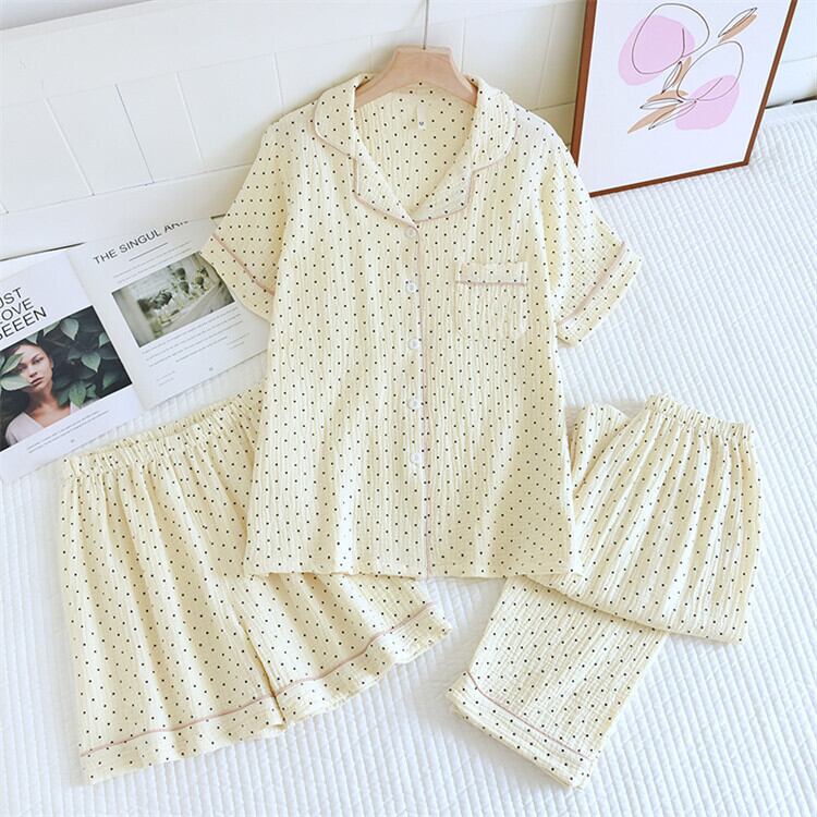 パジャマ ルームウェア 半袖シャツ 長ズボン ショートパンツ 3点セット レディース 6色 M-XL ガーゼ ドット柄 25zm33