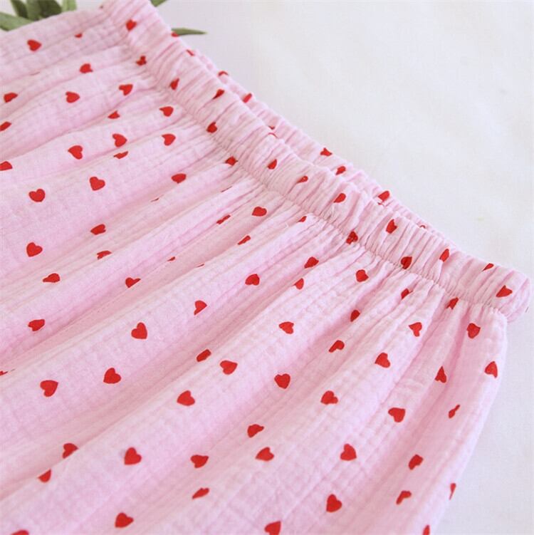 このルームウェアは、半袖シャツに長ズボン、ショートパンツの3点セットが特徴です。軽やかで通気性に優れたガーゼ素材を使用しているため、暑い季節でも快適に過ごせます。おしゃれなドット柄は、部屋着だけでなくおうちでの素敵なひと時にもぴったりです。