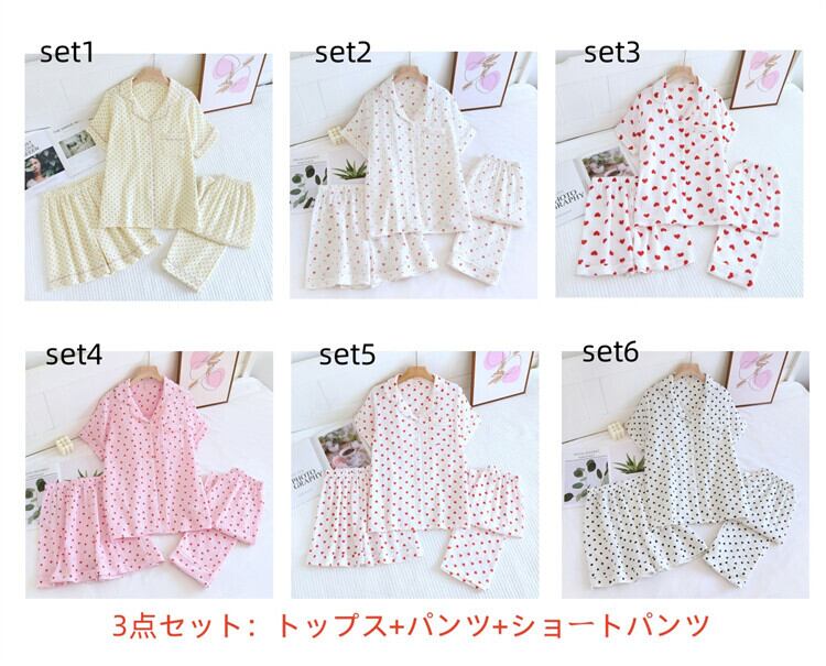 ■商品 パジャマ ルームウェア 半袖シャツ 長ズボン ショートパンツ 3点セット レディース 6色 M-XL ガーゼ ドット柄 韓国 ファッション コーデ おすすめ カジュアル きれいめ 大きいサイズ 人気 ゆったり 20代 30代 40代 50代