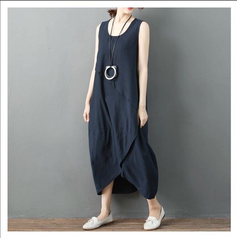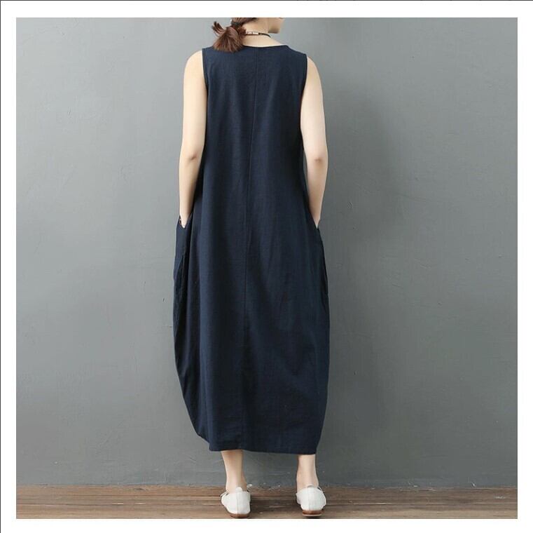 ワンピース ノースリーブワンピース レディース 2色 M-2XL 無地 ロング丈 綿麻 リゾート カジュアル 25zmx03