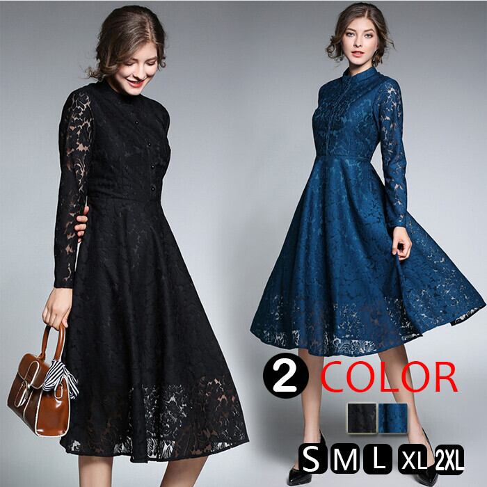 ワンピース パーティードレス レディース 2色 S-2XL 総レース 長袖 フォーマル 結婚式 発表会 上品 25zmx31